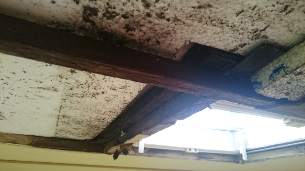 Hinter der Verkleidung aus Sperrholz, welche teilwiese nur noch durch den guten Willen (oder dank der Folien-Beschichtung) zusammen hielt, versteckte sich eine stark zersetzte vermoderte Holzlattung.